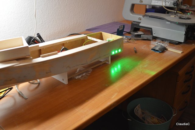 Es ist eine nautisch Beleuchtung, incl. 2 Deckscheinwerfer eingebaut, welche selbstverständlich per RC schaltbar ist. Dazu habe ich dem Boot eine Unterwasserbeleuchtung im Bereich des Jetantriebs spendiert. Sieht bei Nachtfahrten einfach klasse aus.