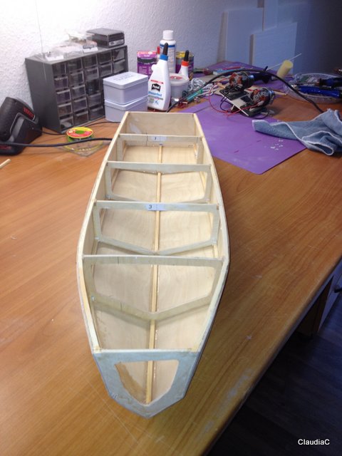 Die Spanten habe ich nach Plan auf meiner Dekupiersäge erstellt. Die Stringer sind aus 4 x 4 mm Kiefernleiste. Beplankt worden sind diese dann mit 1,5mm Flugzeugsperrholz.